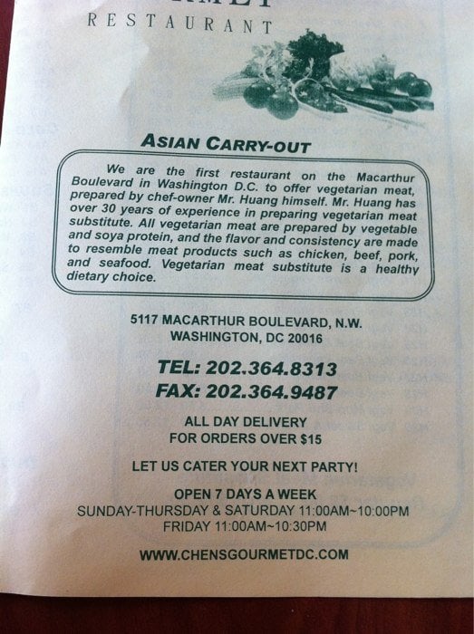 Chen's Gourmet Restaurant, located in Washington, DC, offers a diverse Chinese menu with options for both meat lovers and vegetarians. The hot appetizers, such as the Spicy Wontons and Home Style Spring Rolls, are savory and flavorful. The cold appetizers like Edamame and Cold Noodle with Sesame Peanut Sauce provide a refreshing start to the meal. The soups, including Wonton Soup and Hot and Sour Soup, are hearty and comforting. Customers rave about the vegetarian options and the attentive service provided by the owner. With a cozy atmosphere and quick takeout service, Chen's Gourmet Restaurant is a go-to spot for delicious Chinese cuisine in the DMV area.
